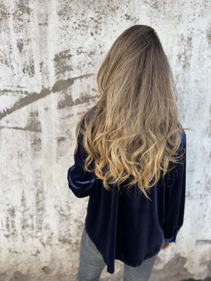 Crafted in bias-cut crushed velvet (100% Polyester), this blouse cascades with vintage-inspired luster. Weighted for graceful drape, it skims the body with subtle stretch for effortless, flattering coverage.